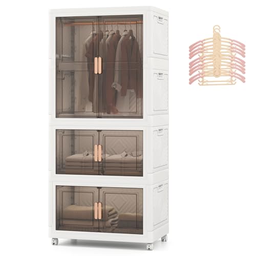 GarveeHome Portable Wardrobe Foldable Plastic Clothes Cabinet with Doors and 4 Wheels Mobile Collapsible Stackable Storage Boxes Containers Closet Organizer for Bedroom, 70 x 41.5 x 154.4 Cm