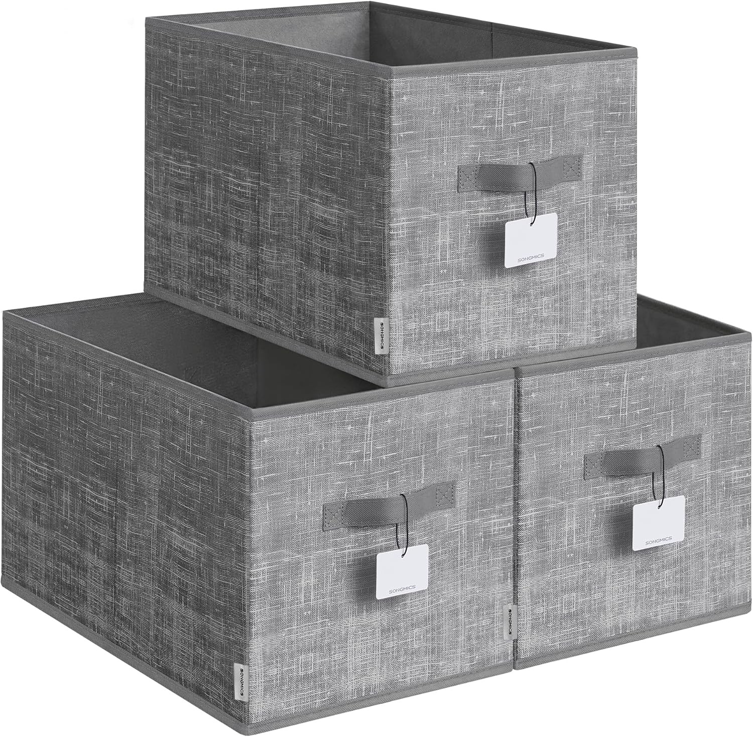 SONGMICES Collapsible Storage Boxes, Set of 3 Fabric Storage Baskets, 50 x 30 x 30 cm, Wardrobe Storage Organisers, 2 Handles, Label Holders, for Bedroom, Living Room, Cattail Grey ROB450G01