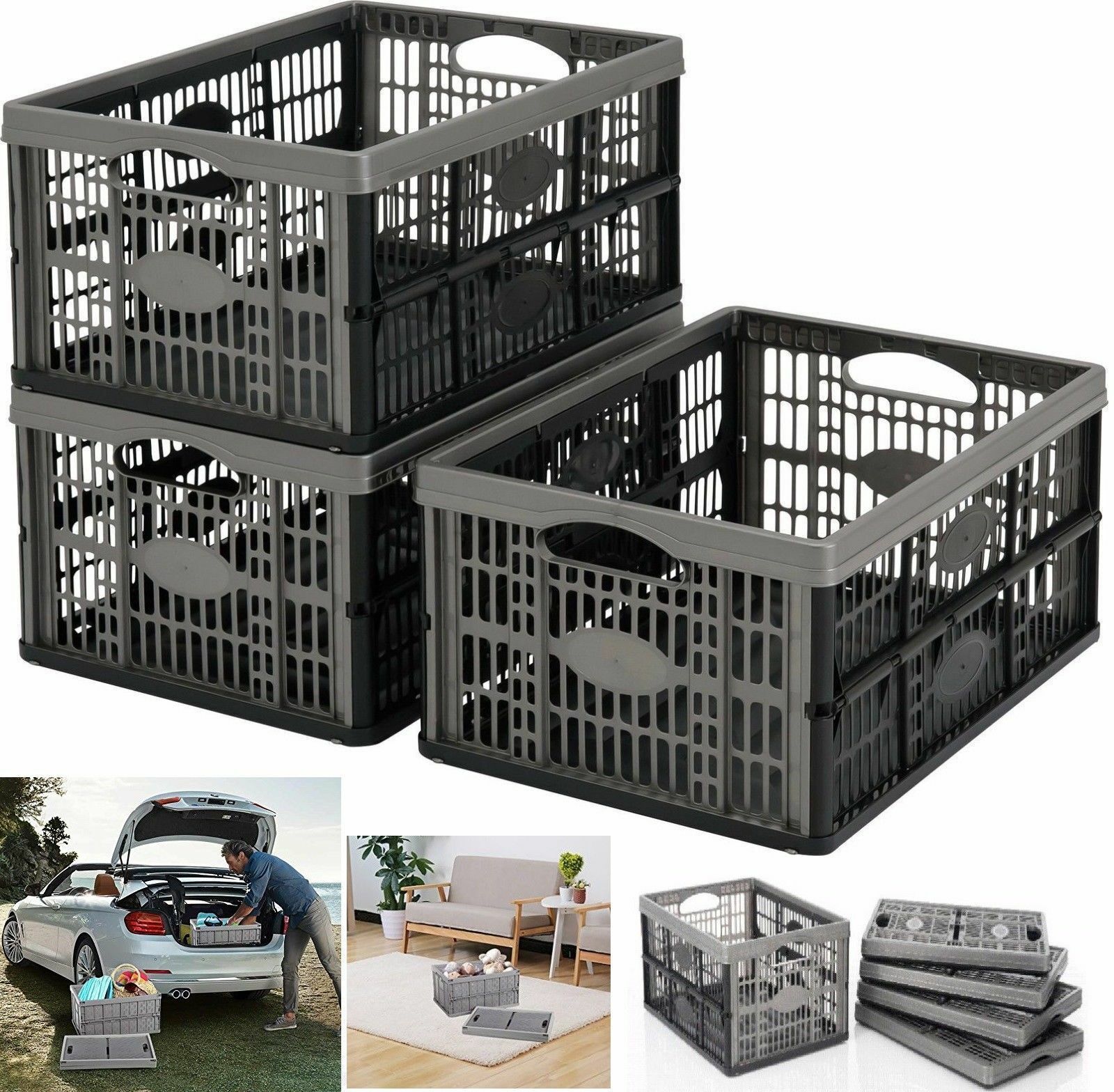 2X THUMBS UP 32L GREY FOLDING CRATE COLLAPSIBLE STACKABLE PLASTIC STORAGE BOXES