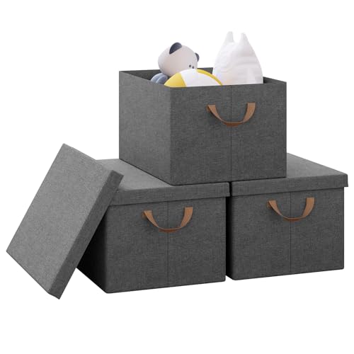 WOLTU Collapsible Storage Boxes Set of 3, Non-Woven Fabric Storage Boxes with Removable Lid, Handles, Metal Frame, 27L, Grey, 48x29x20cm, ABB02gbn-3-UK