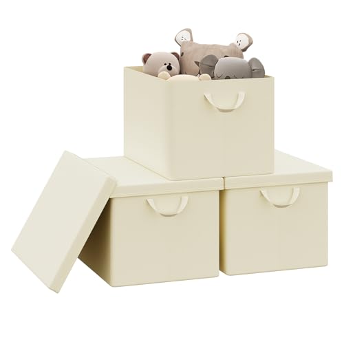 WOLTU Collapsible Storage Boxes Set of 3, Non-Woven Fabric Storage Boxes with Removable Lid, Handles, Metal Frame, 51L, Cream, 48x36x30cm, ABB04cm-3-UK