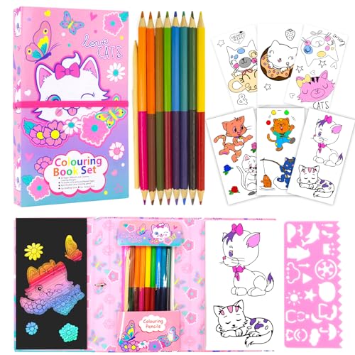 Pinkgarden Cat Coloring Pads Kit for Girls, Cat Coloring Book with 30 Coloring Pages 10 Rainbow Scratch Papers 16 Colored Pencils for Drawing Painting, Travel Coloring Kit for Kids Girls Ages 3-12