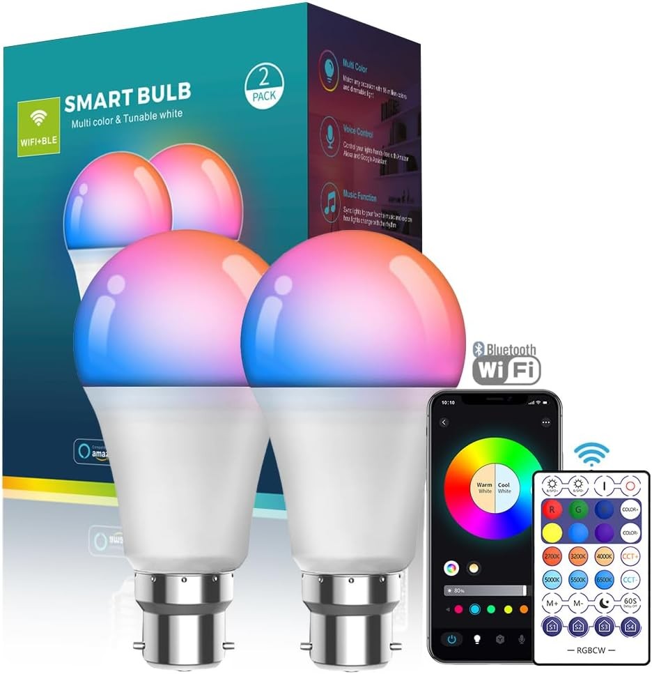 Trust WiFi B22 Smart Bulb, Colour Changing Light Bulb, Works with Alexa and Google Home, No Hub Required, 2.4GHz WiFi Bulb, LED Alexa Light Bulb, White & Colour [Amazon Exclusive] - 2 Pack