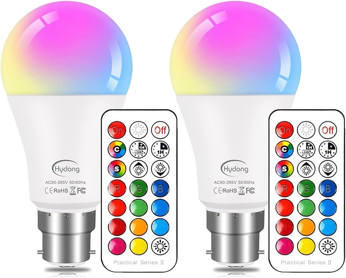 HYDONG Colour Changing Light Bulb B22 Bayonet 10W RGBW LED Light Bulbs with Remote Control,12 Color for Home Decoration, Party, Mood Ambiance Lighting-2 Pack