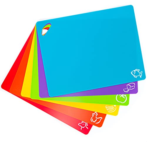 Extra Thick Flexible Plastic Chopping Board (Set of 6) - Plastic Cutting Board Set - Mats with Food Icons & EZ-Grip Waffle Back - Colour Coded Chopping Boards for Kitchens