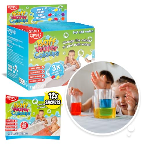 ZIMPLI - 12 x Baff Water Colour Tablets, Each Bag has 3 tabs Giving 35 Total uses, Bath Toy Drops, Party Bag Fillers, Favours