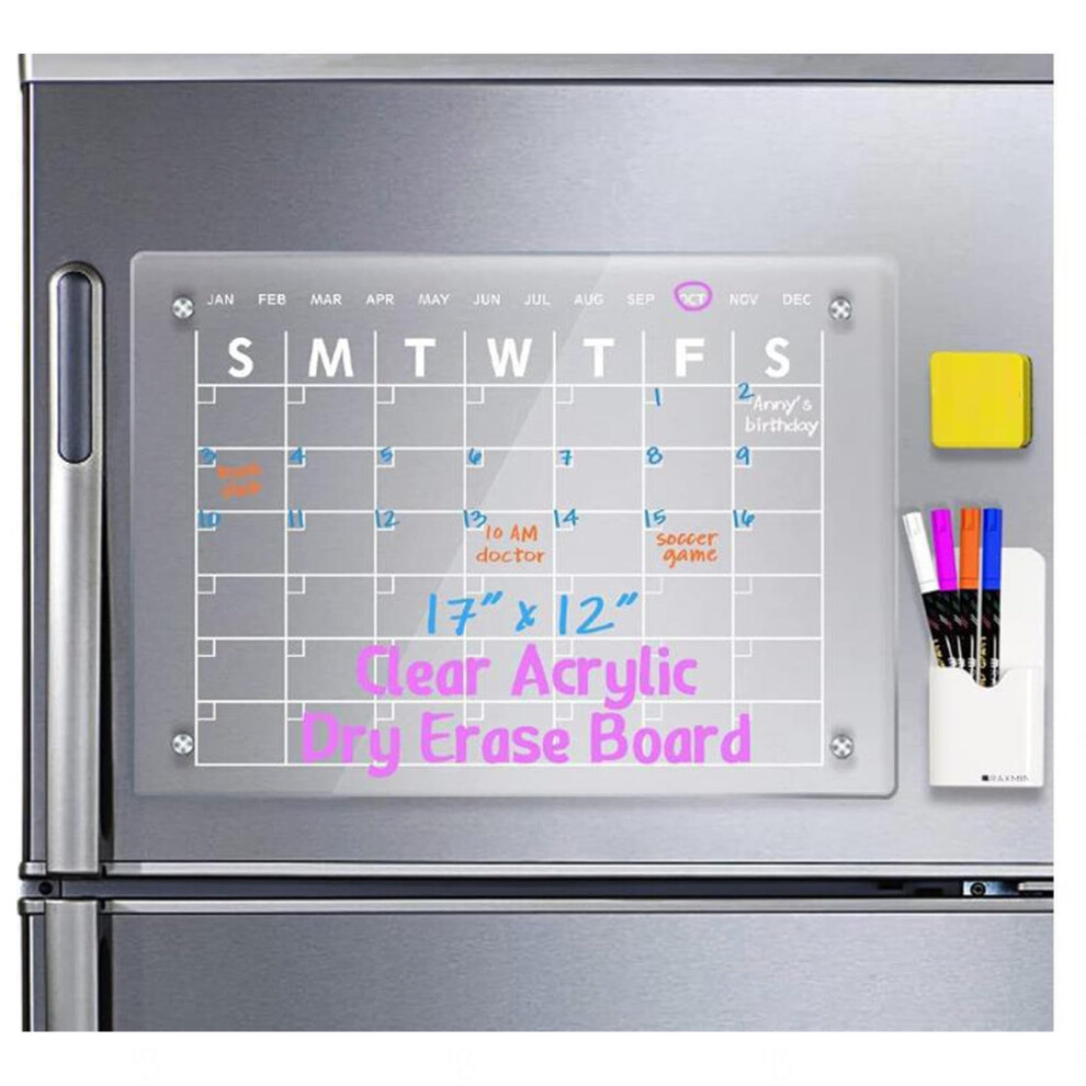 Timetable Wipe Clean, 43 x 30 cm, Glass Calendar Wall, with 4 Coloured Markers, 1 Fridge Eraser and 1 Pen Holder, Acrylic Magnetic Dry Erase Board