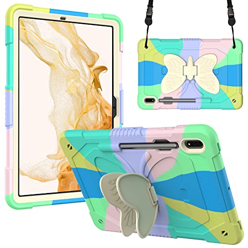 Case for Samsung Galaxy Tab S8 Plus/S7 FE/S7 Plus 12.4 Inch Butterfly Case for Kids with S-Pen Holder Shockproof Stand Cover with Shoulder Strap for Tab S8+ 2022 /S7 FE/S7 Plus Colourful Green