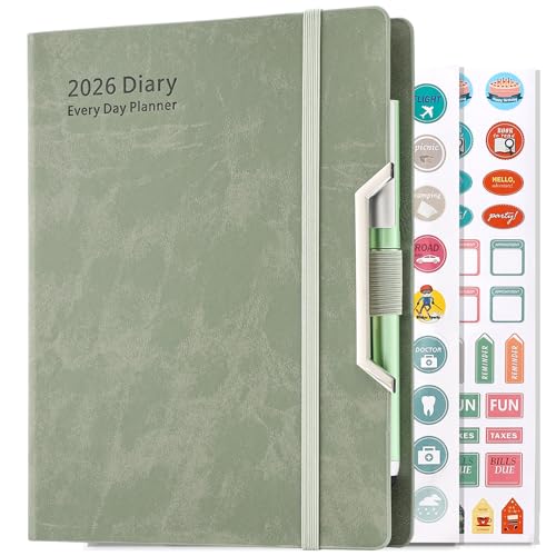 Academic Diary 2026 A5 Page a Day,Daily & Monthly Full Year Planner, 2026 Diary Day Per Page Jan-Dec, Hardcover Organizer with Pen,Colourful Monthly Tabs,Inner Pocket,3 Bookmarks,Stickers (Green)