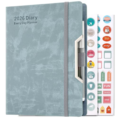 Academic Diary 2026 A5 Page a Day,Daily & Monthly Full Year Planner, 2026 Diary Day Per Page Jan-Dec, Hardcover Organizer with Pen,Colourful Monthly Tabs,Inner Pocket,3 Bookmarks,Stickers (Blue)