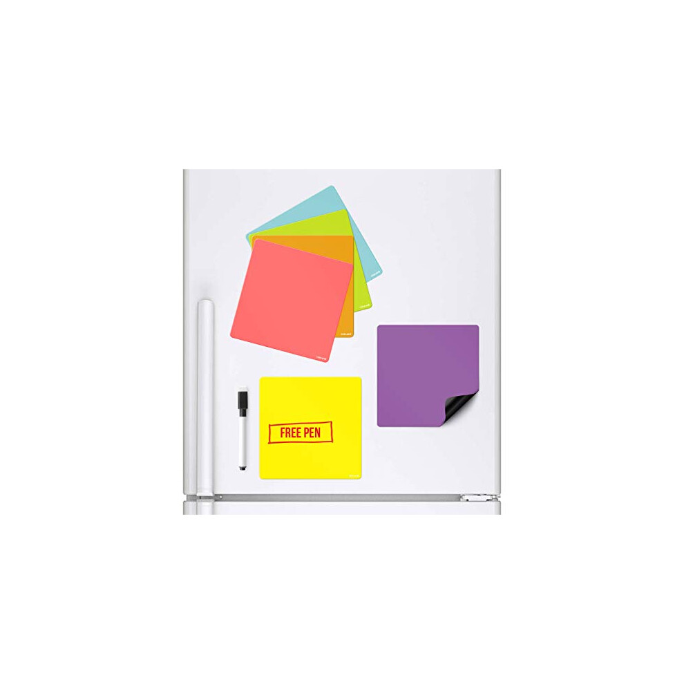 Pack of 6 Coloured Squares Magnetic Whiteboards that stick to your fridge Dry Wipe Planner Magnet Signage Sheet With Marker & Pen Colourful Kitchen