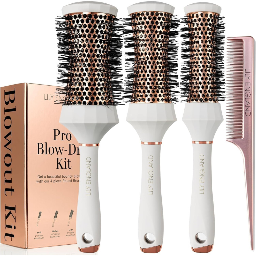 Lily England Round Hair Brush Set, 4 Piece Professional Blow Dry Kit with 3 Round Brushes and Comb for Styling, Beauty Gifts Sets for Women