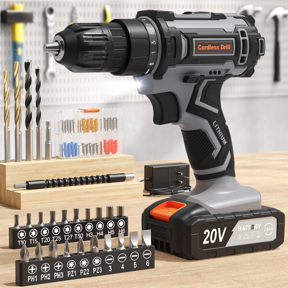 Cordless Drill, 20V Electric Combi Drill Set, Power Drills 370 in-lb 25+1 Torque (Grey)