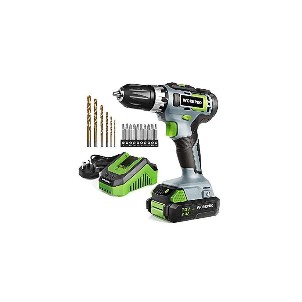 WORKPRO 20V Cordless Drill Driver Lightweight, Double Speed Cordless Combi Drill Set with 16 PCS Accessories, 2.0Ah Li-lon Battery with Fast Char