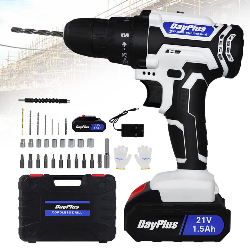 21V Cordless Combi Drill Set Electric Impact Driver Screwdriver, 1.5AH Battery&Fast Charger, Safety Lock 3/8" Chuck, 25+1 Torque Setting