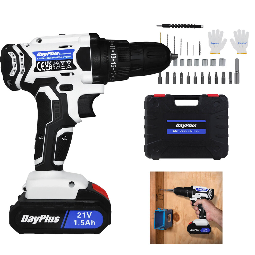 (1 x 1.5Ah Battery) Cordless Combi Drill Set 21V Electric Drill 25+1 Torques Powerful Drill Driver with Case and 26pcs Accessories