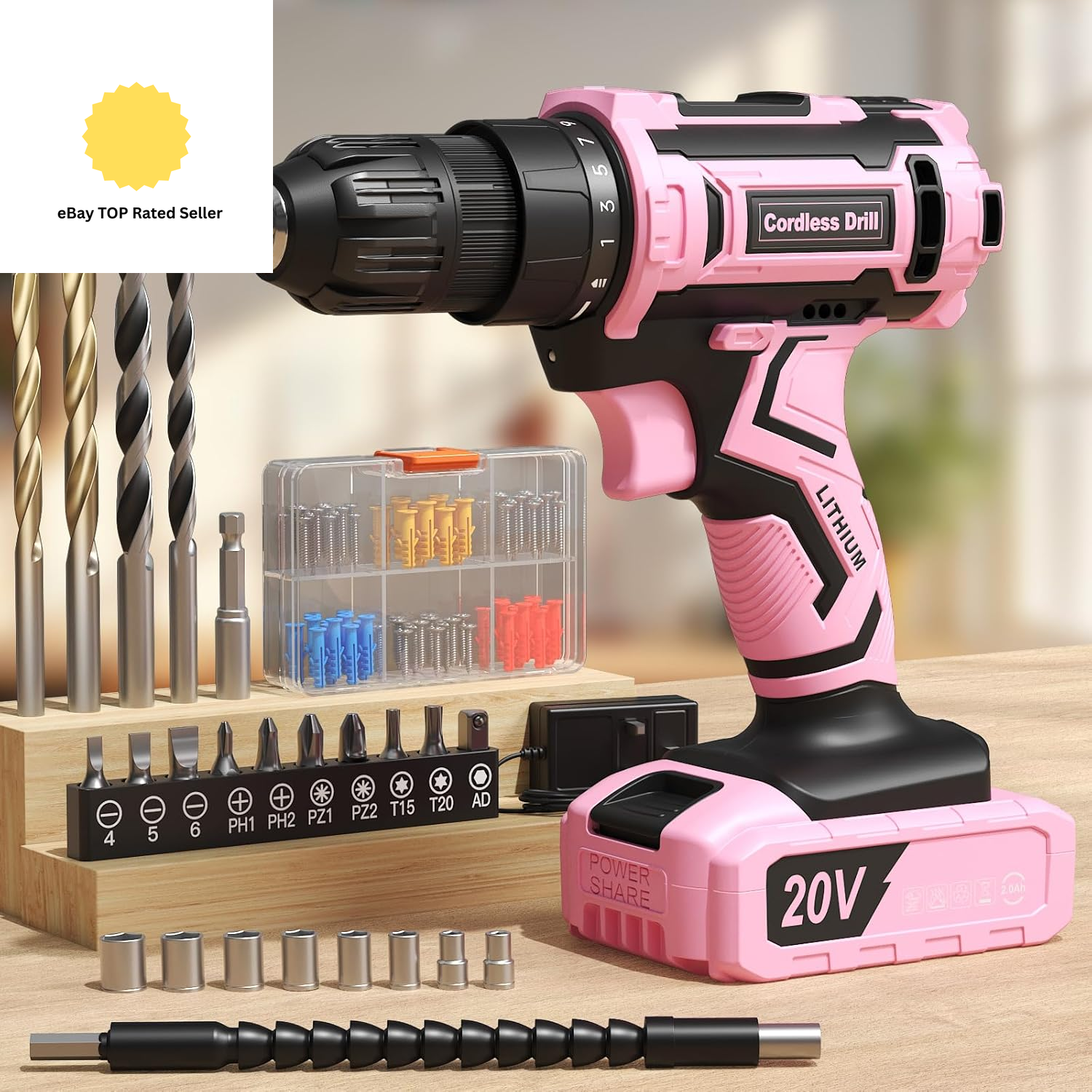 Cordless Pink Drill, 20V Electric Combi Drill Set with 85 Accessories, 2.0Ah Rec