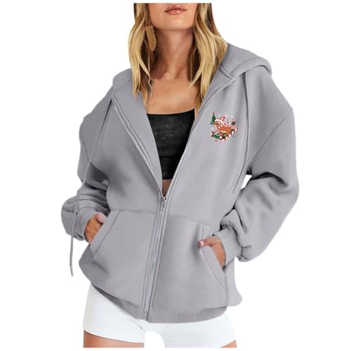 Christmas Sweatshirt for Women Hoodie - Print Zip Up Long Sleeve Front Pocket Drawstring Casual Athletic Pullover Fleece Jacket For Outdoor Winter Comfort (Grey XXL)