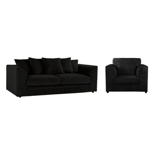Jumbo Cord 3+2 Seater Sofa|Black Dual Arm Couches|Comfy Corner Settees & Arm Chair|Scatter Back Settees Suites|3 Piece Sofa Suite for Living Room (Arm Chair)