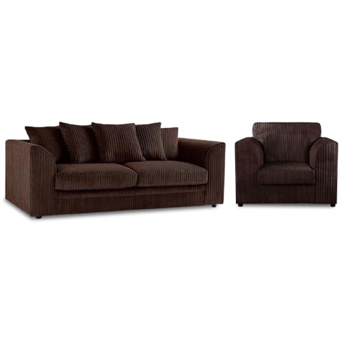 Jumbo Cord Settee - Chocolate Brown 3+1+1 Seater Sofa Set - Modern Suites & Footrest - Upholstered Scatter Back Couches - Comfy Arm Chair - Essential Large Size Footstool for Living Room (3 Seater)