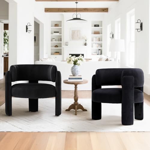 COLAMY Living Room Armchairs, Modern Velvet Accent Chair, Comfy Round Upholstered Arm Chair with 3 Legs, Single Sofa Chair with Lounge Seat for Bedroom/Office/Reading Spaces (Black, Set of 2)