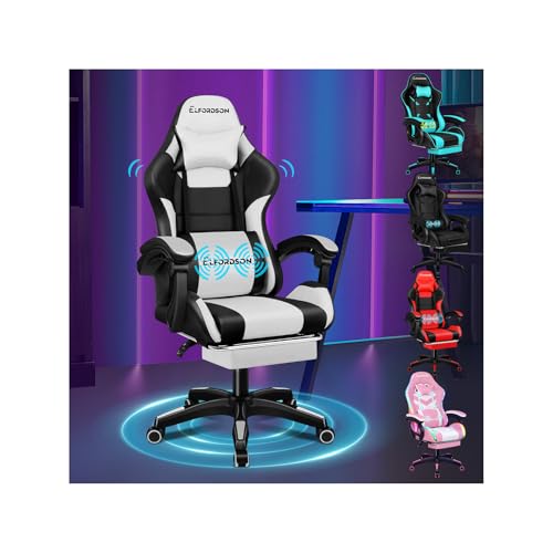 ELFORDSON Massage Gaming Chair with 2-Point Massage on Lumbar, Comfy Computer Office Chairs with Headrest Pillow Footrest Tall Back Recliner Swivel for Home Office, White & Black