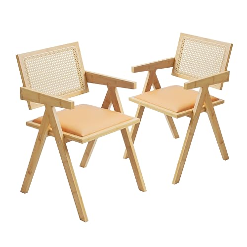 Modern Mid Century Bamboo Dining Chairs, Comfy Rattan Armchair with Soft Seat Cushion and Wide Rattan Backrest, Upholstered Leather Wood Chairs for Bedroom Living Room Reading Room (Natural, 2)