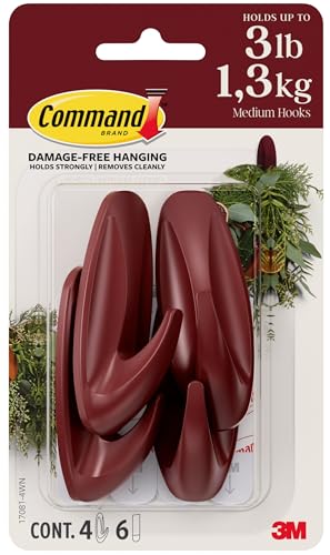 Command Medium Designer Hooks, Mulled Wine Red, 4 Hooks, 6 Strips, Damage-Free Hanging with Adhesive, No Tools Great for Hanging Home Decor, Holds up to 1.3kg