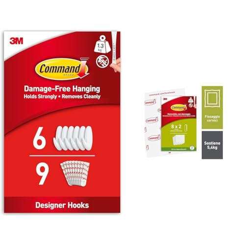 Command Medium Designer Hooks, White - Pack of 6 Hooks and 9 Adhesive Strips - Damage Free Hanging & Picture Hanging Strip Value Pack - 8 x 2 Medium Adhesive Picture Hanging Strips