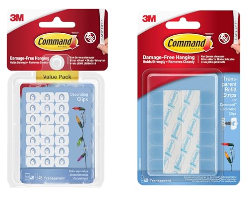 Command Hooks, Extra Value Bundle Pack of 40 Clips and 88 Small Adhesive Clear Refill Strips, for Christmas Decorations and Fairy Lights
