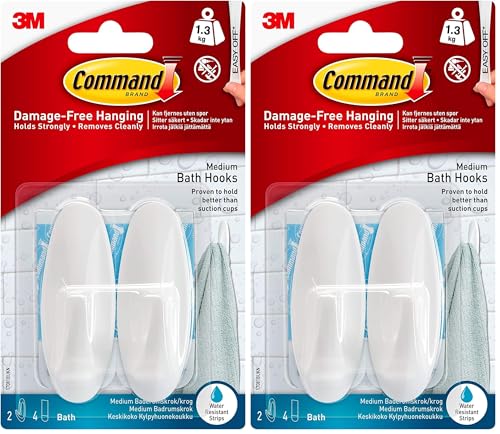 Command Bath Designer Hooks, White, Water Resistant - 2 Medium Hooks and 4 Adhesive Strips - Hang Towels, Robes and Other Bathroom Accessories - Ideal to Avoid Drilling Through Tiles (Pack of 2)
