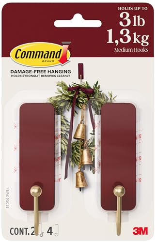 Command Medium Wall Hooks, Mulled Wine Red, 2 Hooks, 4 Strips, Damage-Free Hanging with Adhesive, No Tools Great for Hanging Home Decor, Holds up to 1.3kg