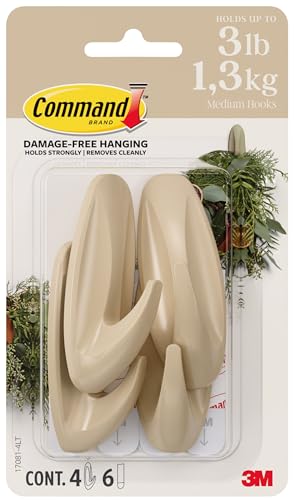 Command Medium Designer Hooks, Latte Brown, 4 Hooks, 6 Strips, Damage-Free Hanging with Adhesive, No Tools Great for Hanging Home Decor, Holds up to 1.3kg