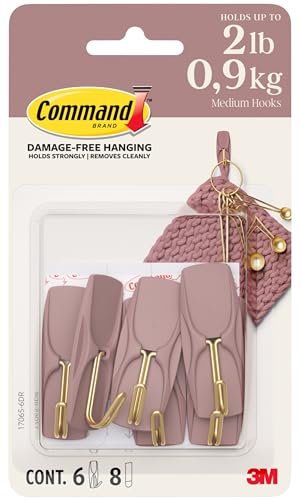 Command Medium Wire Hooks, Dusty Rose, 6 Hooks, 8 Strips Damage-Free Hanging with Adhesive, No Tools Great for Hanging Home Decor, Holds up to 900g