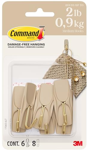 Command Medium Wire Hooks, Latte Brown, 6 Hooks, 8 Strips Damage-Free Hanging with Adhesive, No Tools Great for Hanging Home Decor, Holds up to 900g