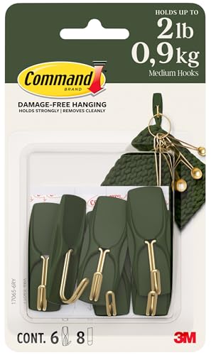Command Medium Wire Hooks, Rosemary Green, 6 Hooks, 8 Strips Damage-Free Hanging with Adhesive, No Tools Great for Hanging Home Decor, Holds up to 900g