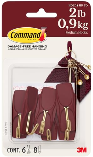 Command Medium Wire Hooks, Mulled Wine Red, 6 Hooks, 8 Strips Damage-Free Hanging with Adhesive, No Tools Great for Hanging Home Decor, Holds up to 900g