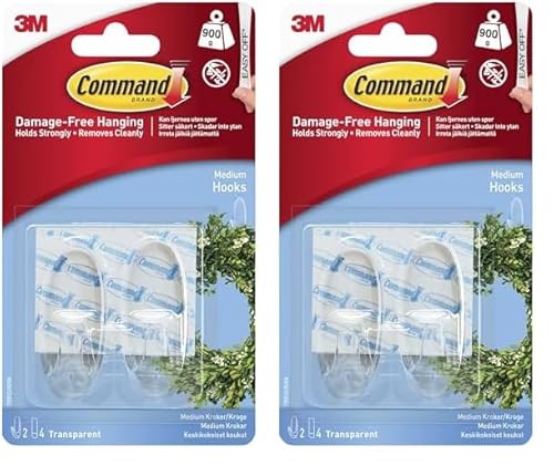 Command Large Hook, Pack 1 Hook and 2 Adhesive Strips, Transparent - Damage Free Hanging & Medium Hook, Pack of 2 Hooks and 4 Adhesive Strips, Transparent - Damage Free Hanging
