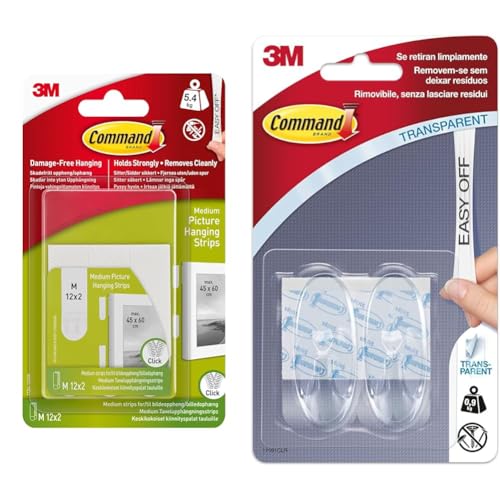 Command Medium Picture Hanging Strips, Pack of 12x2 Adhesive Strips, White - Damage Free Hanging & 17091CLR UU001540556 Pack of 2 Medium Hooks with Strips, Clear, Colourless, Standard, Set of 2 Pieces