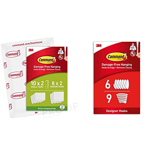 Command GP081-6EU Designer Hooks, White - Pack of 6 Hooks and 9 Adhesive Strips- Holds up to 1.3kg&17002-VP-6PK Hooks with Strips Value Pack (6 Hooks and 12 Small Adhesive Strips Each)