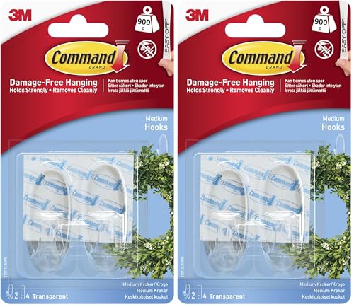 Command Medium Hook, Pack of 2 Hooks and 4 Adhesive Strips, Transparent - Damage Free Hanging - Holds up to 900g
