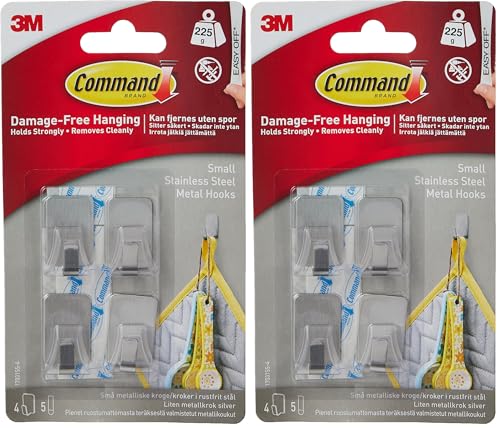 Command Small Stainless Steel Metal Hooks - 4 Hooks, 5 Adhesive Strips - Damage Free Hanging for Wall and Door (Pack of 2)