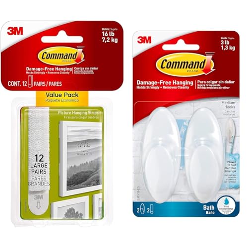 Command Picture & Frame Hanging Strips Value Pack, Large, White, 12-Pairs - Damage Free Hanging & BATH18-ES Medium Bath Hooks with Water Resistant Strips