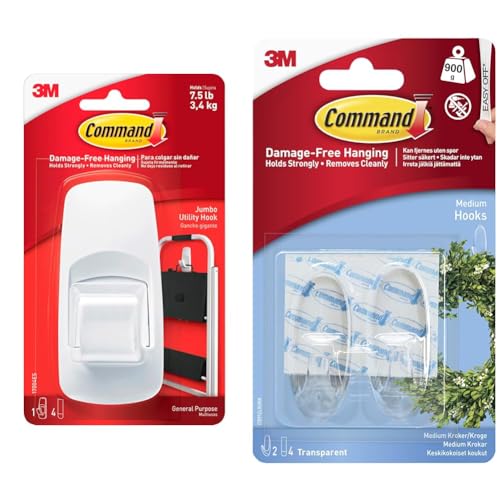 Command Jumbo Utility Hook, Pack of 1 Hook and 4 Adhesive Strips, White, Damage Free Hanging & Clear Medium Hooks