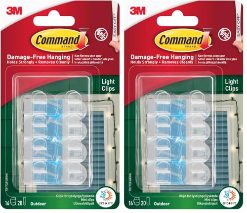 Command Outdoor Decorating Light Clips - 16 Mini Hooks and 20 Small Adhesive Strips,Transparent - Clips for Hanging Decorations and Fairy Lights Outdoors - Damage Free Hanging (Pack of 2)