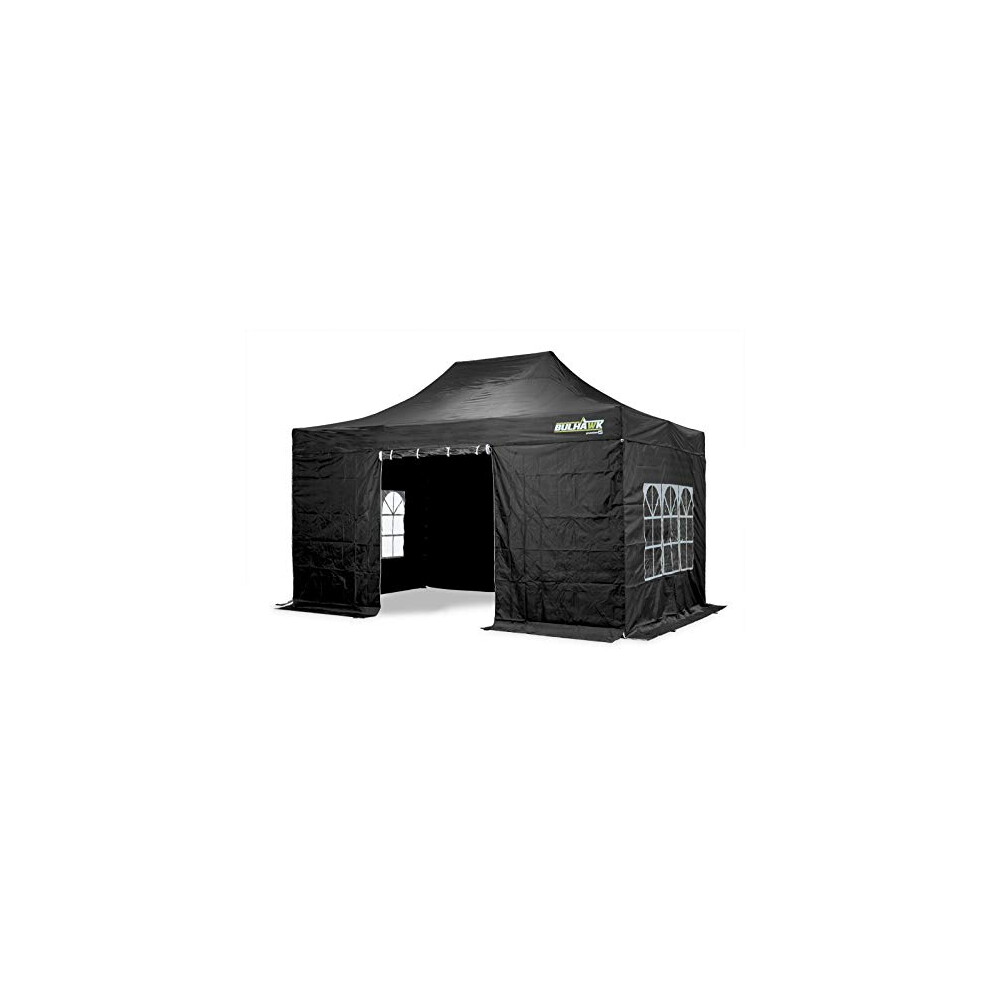 BULHAWK® 3M x 4.5M PREMIUM 32 COMMERCIAL GRADE, WATERPROOF, HEAVY DUTY POP UP GAZEBO MARKET STALL MARQUEE, INCLUDES 4 X 100% WATERPROOF SIDEWALLS AND CARRY BAG (3m x 4.5m Black including side panels)