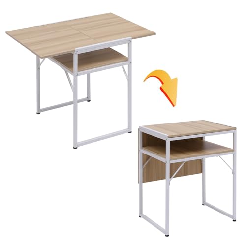 Rainbow Tree Compact Folding Dining Table With 2-Tier Storage Shelf - Extendable Drop Leaf Space Saving Computer Desk for Small Spaces, Multifunction Study Desk (Foldable 90cm White)