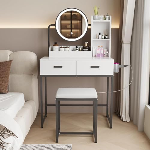 YOURLITE Small Dressing Table with Lighted Mirror and Lights, Compact Vanity Table with with Drawers for Bedroom, Mini White Modern Makeup Desk with Hair Dryer Rack and Cushioned Stool (White&Black)
