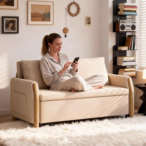 GildedGrove Compact Convertible Loveseat Sofa Bed with Storage, Beige Fabric Upholstery, Wooden Arms, Pull-Out Design, Multi-Position Sleeper for Small Spaces (Khaki, 137cm)