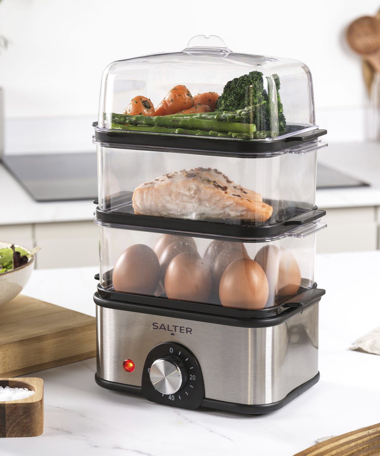 Salter EK5885 3-Tier Food Steamer - Compact Multi-Cooker with 3 Baskets, 8-Egg Capacity, 3L, 60-Min Timer, Egg & Veg